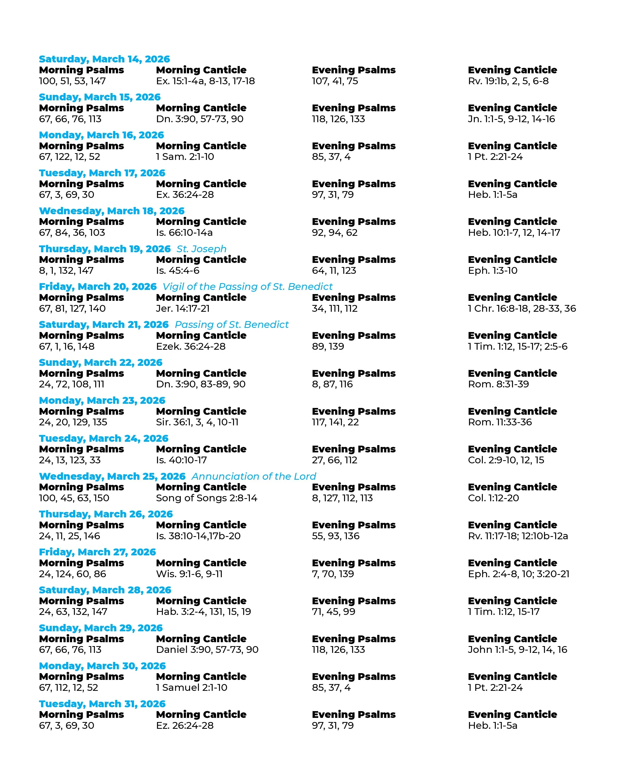 Back to All Events March Psalms Saturday, March 14, 2026 12:00 AM Tuesday, March 31, 2026 11:59 PM Google Calendar ICS