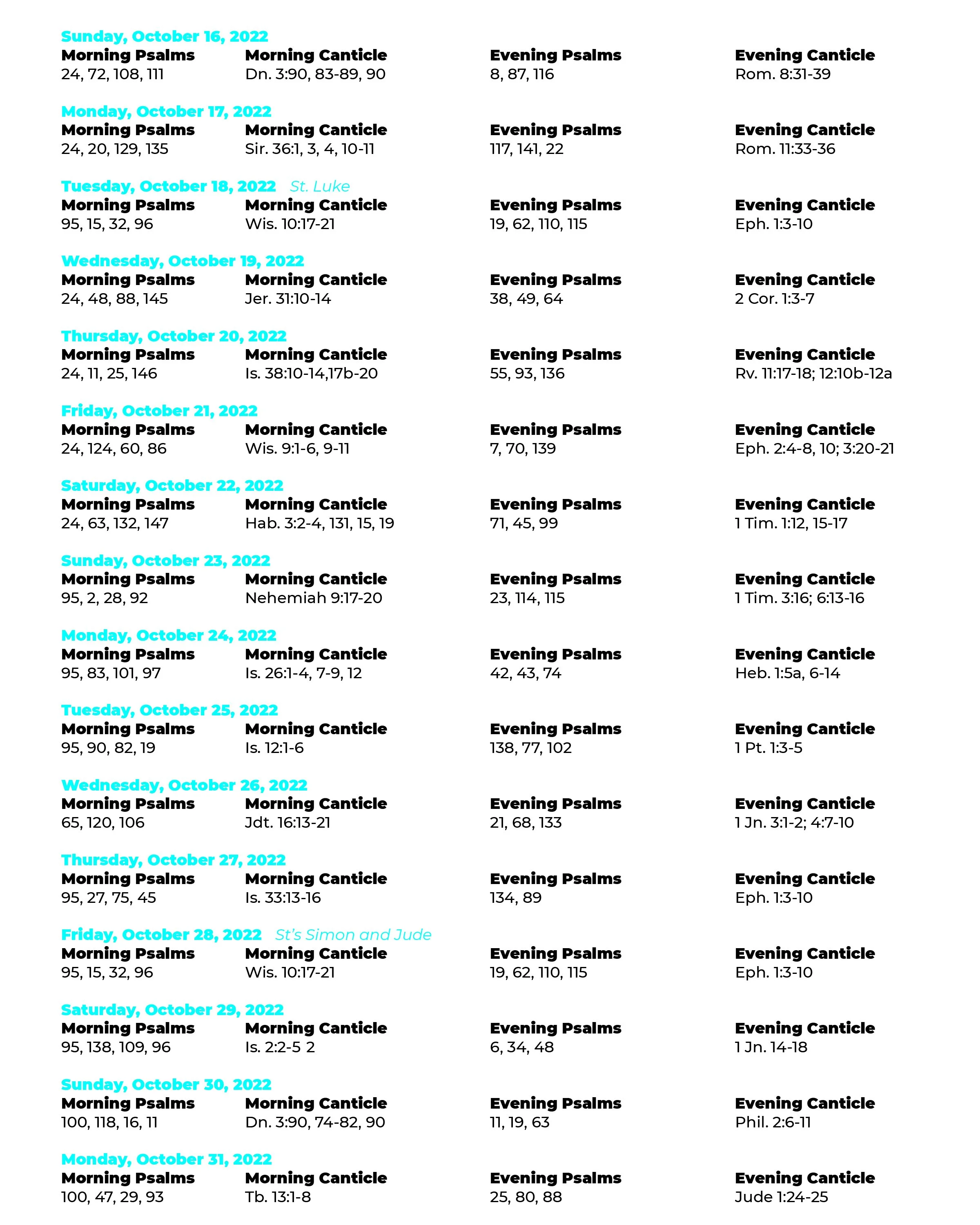October Psalms Sunday, October 16, 2022 12:00 AM Monday, October 31, 2022 11:55 PM Google Calendar ICS